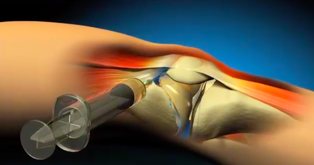 Aplicação de uma injeção num local determinado do corpo; nesse caso numa articulação.